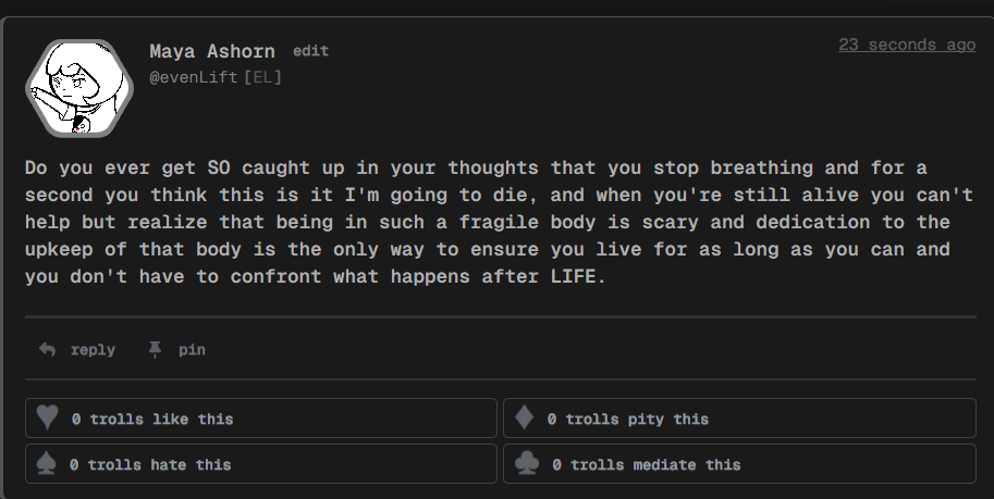 Do you ever get SO caught up in your thoughts that you stop breathing and for a second you think this is it I'm going to die, and when you're still alive you can't help but realize that being in such a fragile body is scary and dedication to the upkeep of that body is the only way to ensure you live for as long as you can and you don't have to confront what happens after LIFE.