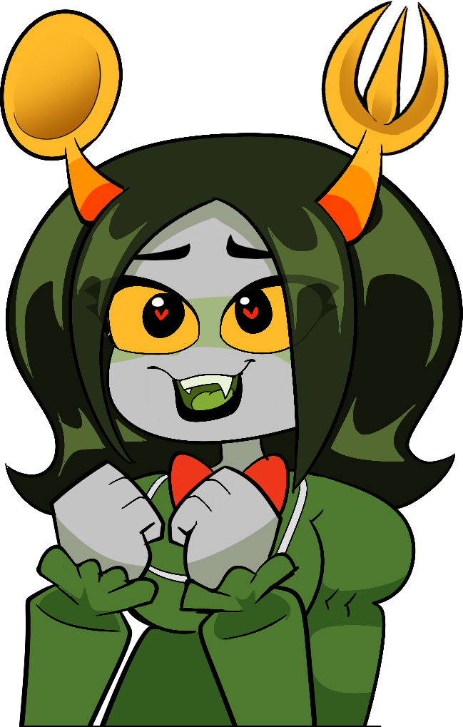 https://files.catbox.moe/hhocp3.png This is me as well, happy to make your acquaintance my new friends~ Your name is Cookin Clenup and you are 12 sweeps old. You are Aerros' best up and coming MAID currently working under an indigo blood keeping their hive in tip top shape. This job has been going a lot better than the last few, previous jobs have had a rather...SUDDEN ENDING with your previous employers turning up DEAD come morning . You've been INVESTIGATED too many times to count. But your reputation is as squeaky clean as the floors you wash! Your interests include well...COOKING and CLEANING! You've got an ARSENAL OF TOOLS on hand for most situations. You always take great interest in learning EVERYTHING you can about your current employer, sometimes to an OBSESSIVE DEGREE. Their height, sleep schedule, diet, favorite places to be, it interests you but you DON'T KNOW WHY. You've always been confused as a OLIVEBLOOD due to your bloods UNUSUAL HUE but you are 100% a JADEBLOOD. With how your blood borders right between the two, it almost feels like you're living TWO LIVES at once! One things you know for certain, you DO NOT belong in any jade cloister. You're always looking for new work, after all what is a maid without someone to work under! You've tried more physical intensive jobs, but your DELICATE FRAME just isn't meant for hard work, unless you count scrubbing floors. Your trolltag is cleanAnomoly and you write in a way that _____. Another work day over, guess the Jobs done! (A little edit to add in the full story for folks~)